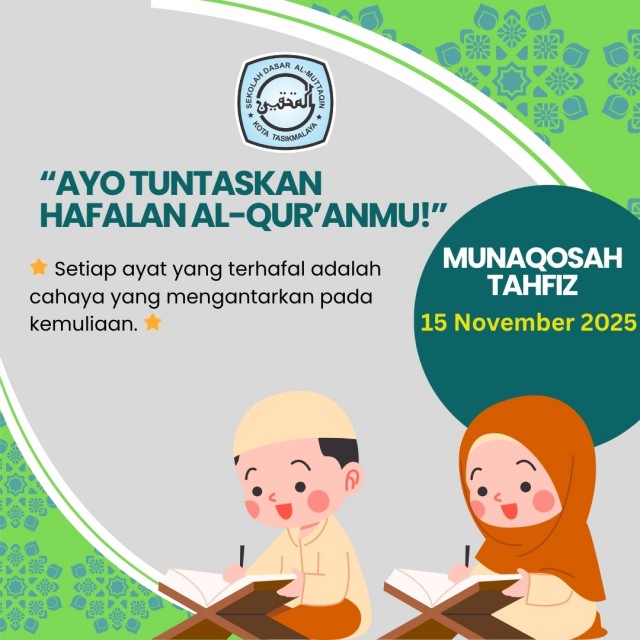 Setiap ayat yang terhafal adalah cahaya yang akan mengantarkan pada kemuliaan. Melalui Munaqosah Tahfidz, SD Al-Muttaqin berkomitmen mendidik siswa menjadi generasi yang tidak hanya unggul dalam akademik, tetapi juga kokoh dalam iman, berakhlaq mulia, serta cinta Al-Qur’an.