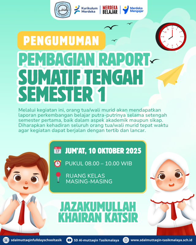 Pada hari Jum’at, 10 Oktober 2025, SD Al-Muttaqin akan menyelenggarakan kegiatan Pembagian Raport Sumatif Tengah Semester 1.