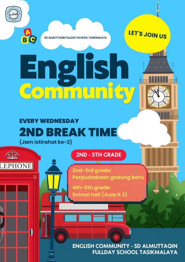 SD Al-Muttaqin Tasikmalaya terus berupaya mewujudkan sekolah yang unggul dalam kesholehan, prestasi, inovasi, dan peduli lingkungan melalui berbagai program yang kreatif dan bermanfaat. Salah satunya adalah English Community, ruang belajar santai dan menyenangkan yang dilaksanakan setiap hari Rabu pada jam istirahat kedua untuk siswa kelas 2 hingga 5.